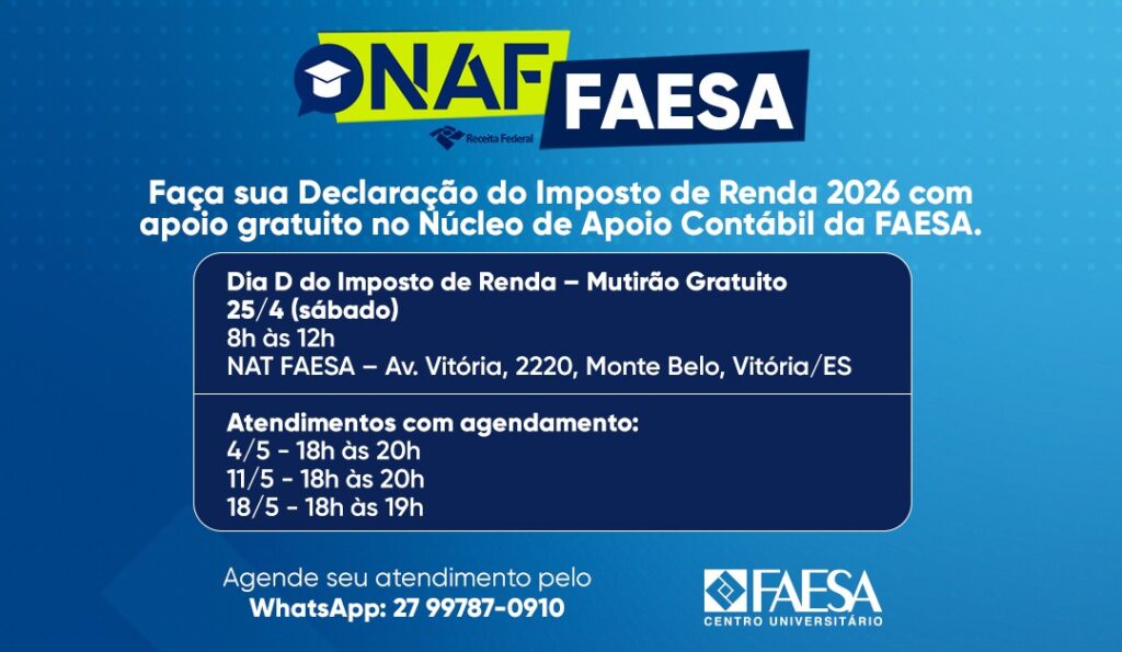 Com o início do período de envio do Imposto de Renda 2026, muitos contribuintes ainda têm dúvidas sobre como preencher corretamente a declaração. Para ampliar o acesso ao serviço e oferecer suporte qualificado à população, o Núcleo de Apoio Contábil da FAESA (NAF) realiza, no sábado (25), o Dia D do Imposto de Renda, um […]